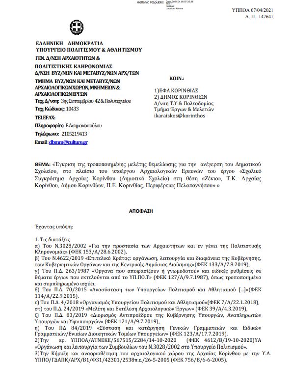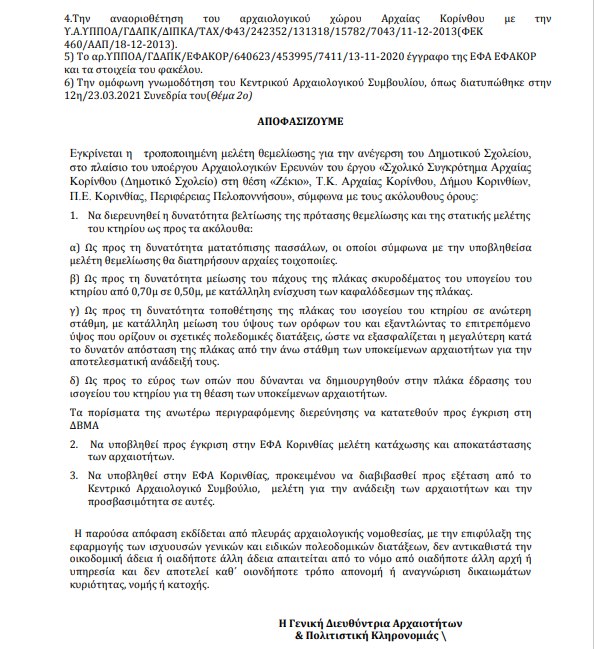 Το Κεντρικό Αρχαιολογικό Συμβούλιο, με απόφαση που αναρτάται σήμερα εγκρίνει την τροποποιημένη μελέτη για την ανέγερση του Δημοτικού Σχολείου Αρχαίας Κορίνθου, αποδεχόμενο την αναγκαιότητα της υλοποίησης του. Στην απόφαση περιλαμβάνονται επίσης οι όροι βελτίωσης της πρότασης θεμελίωσης και της στατικής μελέτης καθώς και οι όροι για την προστασία και ανάδειξη των αρχαιοτήτων.