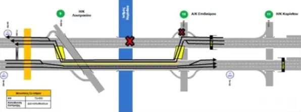 Σύμφωνα με απόφαση της Διεύθυνσης Αστυνομίας Κορινθίας για το διάστημα που θα ισχύουν οι κυκλοφοριακές ρυθμίσεις στην περιοχή δεν θα λειτουργεί η είσοδος του κόμβου Επιδαύρου (ΧΘ 76,4) στο ρεύμα προς Αθήνα. Όσοι θέλουν να εισέλθουν στον αυτοκινητόδρομο μέσω του συγκεκριμένου κόμβου με προορισμό την Αθήνα θα κατευθύνονται με τη σχετική πληροφοριακή σήμανση προς τον προηγούμενο κόμβο Κορίνθου (ΧΘ 81,1), θα κάνουν αναστροφή και θα εισέρχονται στον αυτοκινητόδρομο (κόκκινη διακεκομμένη γραμμή), ενώ τα ελαφρά οχήματα (<3Τ) μπορούν να εξυπηρετούνται και μέσω της βυθιζόμενης γέφυρας των Ισθμίων.